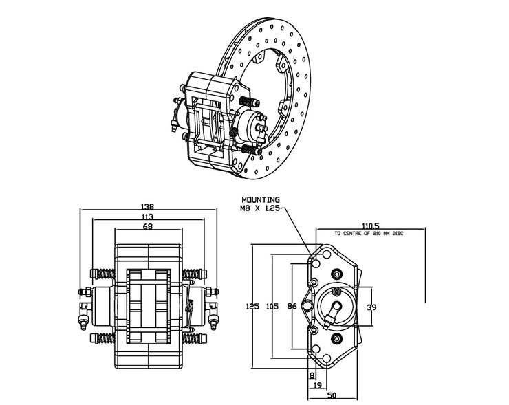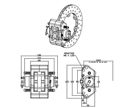 2 Piston Hydraulic Caliper with Pad Spring Return - 86mm Mounting Hole Centers